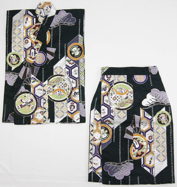 羽織と着物のセットで、着物は2部式で上着とスカートと分かれており、上着は着用しやすく袖がありません、スカートはマジックベルトで開閉で後ろがゴムで、上着は紐がありませんので衿が広がる場合はスカートの中に入れて着用してください、着付けが大変に簡単です。