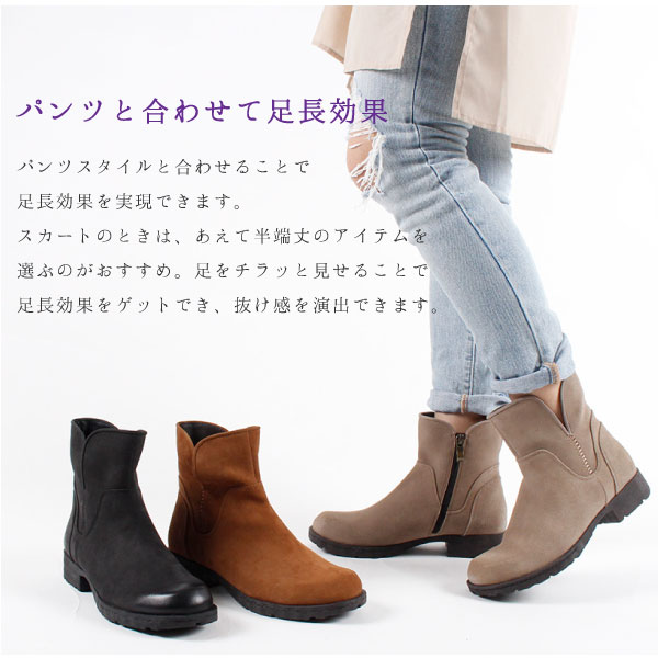 素材 表素材:牛革 裏素材:合成ファー(アクリル) 中敷素材:合成皮革+クッション ソール素材:ラバーブーツ丈:14.5cm(ヒール含まず) ヒール高 3.3センチ サイズ感 3E程度(やや広め)
