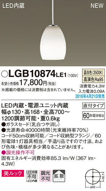LED(温白色) 1個W直付タイプLED内蔵電源ユニット内蔵LED(温白色タイプ)1個WΦ130・H168●コード50cm収納可能●コード収納型フランジ●手造り品ですので寸法、および色味・模様が多少異なることがあります。